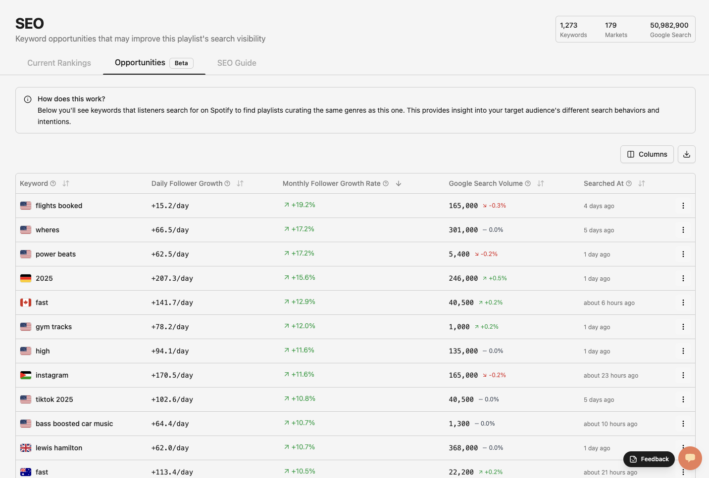 New Features Added "Opportunities" section to the Keywords tab on playlists to help improve playlist search visibility. * This feature is in Beta. Please let us know how we can improve it.